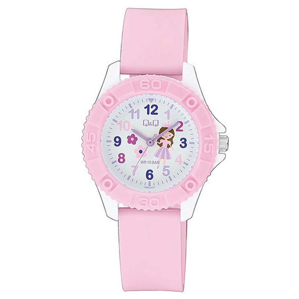 Q&Q analóg gyerek karóra, fehér színű műanyag tok, rózsaszínű műanyag szíj, fehér figurás számlap, ásványüveg, quartz szerkezet, 100 m (10 ATM) vízállóság - VQ96J027Y