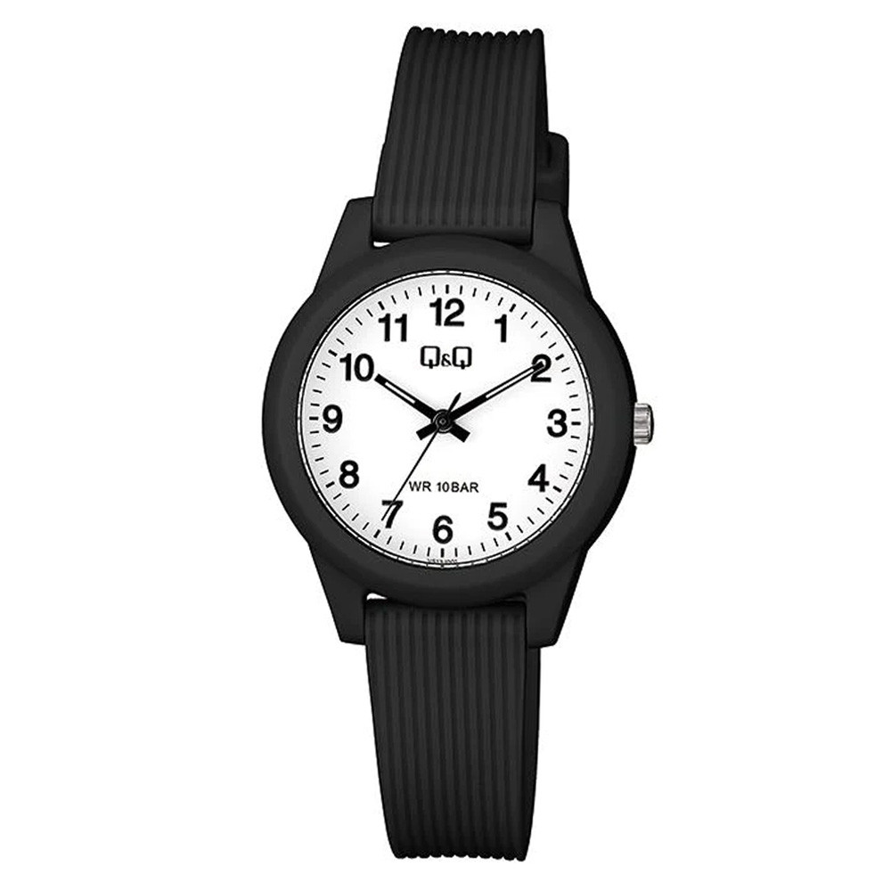 Q&Q analóg női karóra, fekete színű műanyag tok, fekete műanyag szíj, arab számos fehér számlap, ásványüveg, quartz szerkezet, 100 m (10 ATM) vízállóság - VS13J001Y