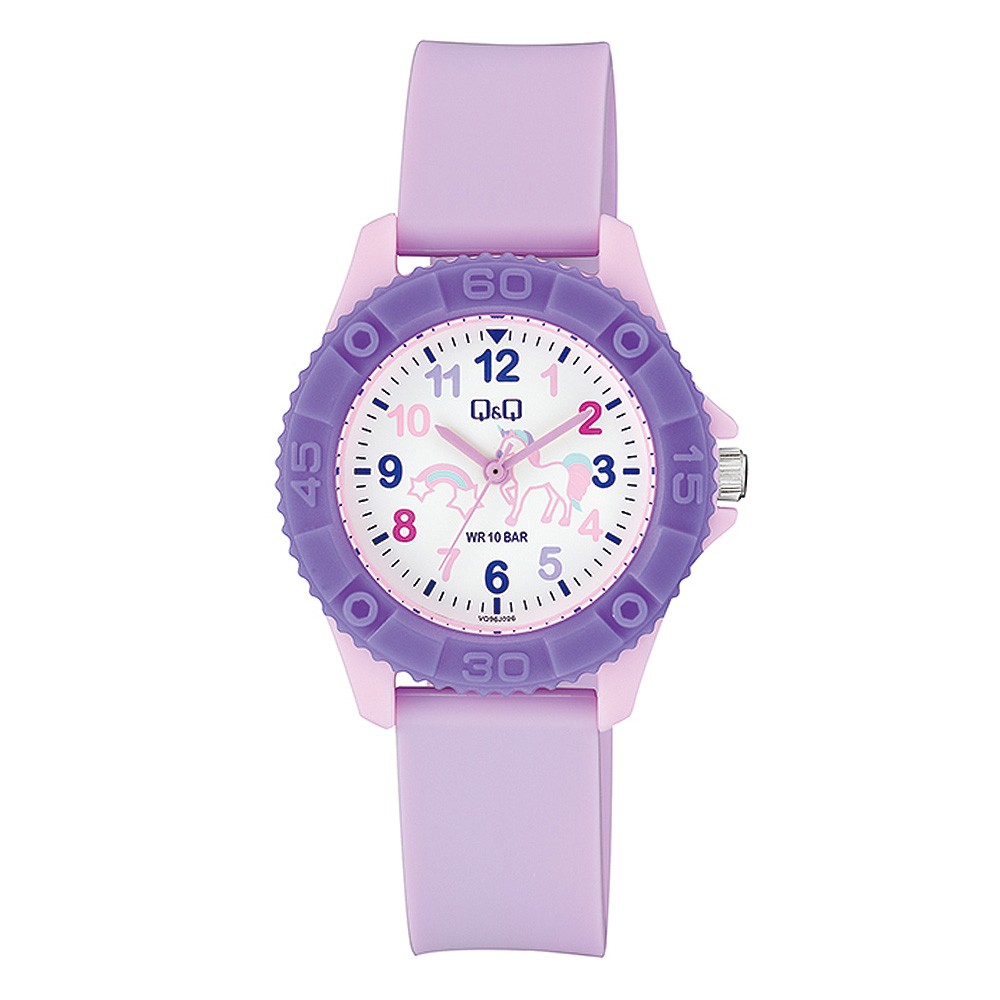 Q&Q gyerek karóra, quartz, rózsaszín/lila színű tok, rózsaszín szíj, fehér/figurás számlap, VQ96J026Y