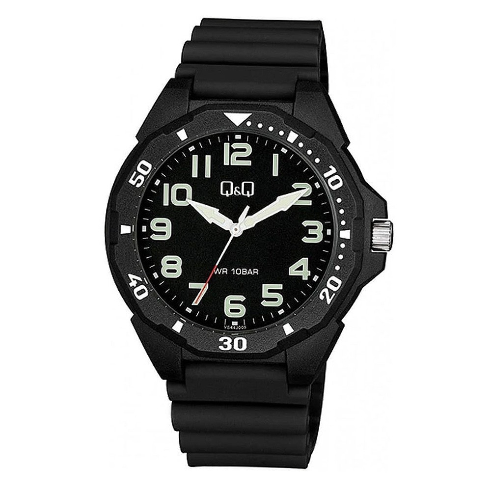 Q&Q Sportos Férfi Karóra – Fekete Műanyag Tokkal, Lumineszcens Számokkal és 10 Bar Vízállósággal