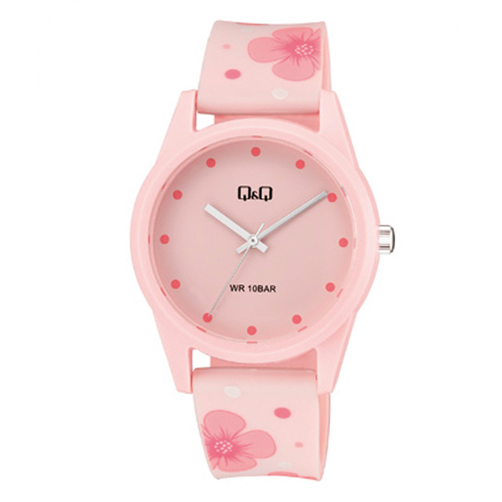 Q&Q Virágmintás Női Karóra – Rózsaszín Műanyag Tokkal, Pöttyös Indexekkel és 10 Bar Vízállósággal