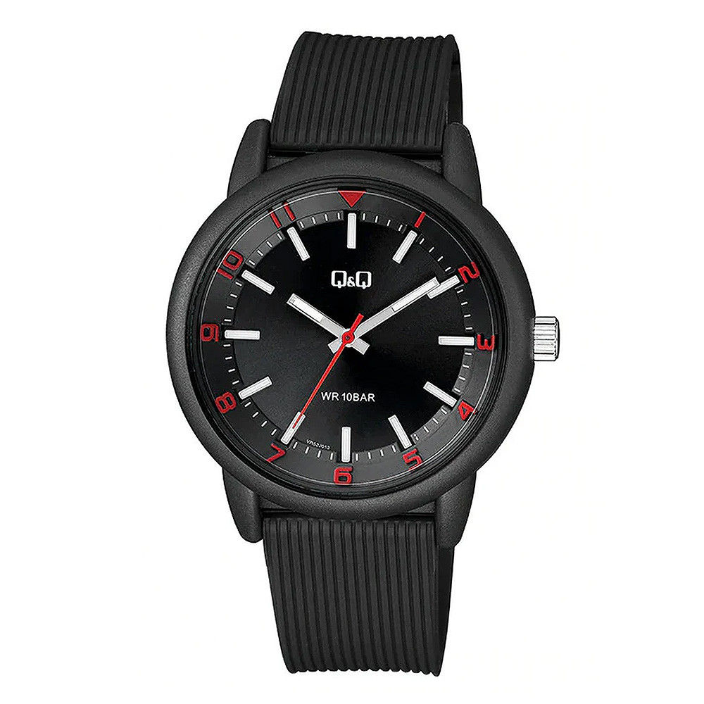 Q&Q Sportos Férfi Karóra – Fekete Műanyag Tokkal, Vörös Hangsúlyokkal és 10 Bar Vízállósággal