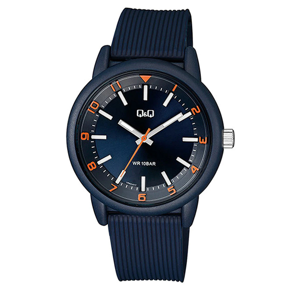 Q&Q Sportos Férfi Karóra – Kék Műanyag Tokkal, Narancssárga Hangsúlyokkal és 10 Bar Vízállósággal