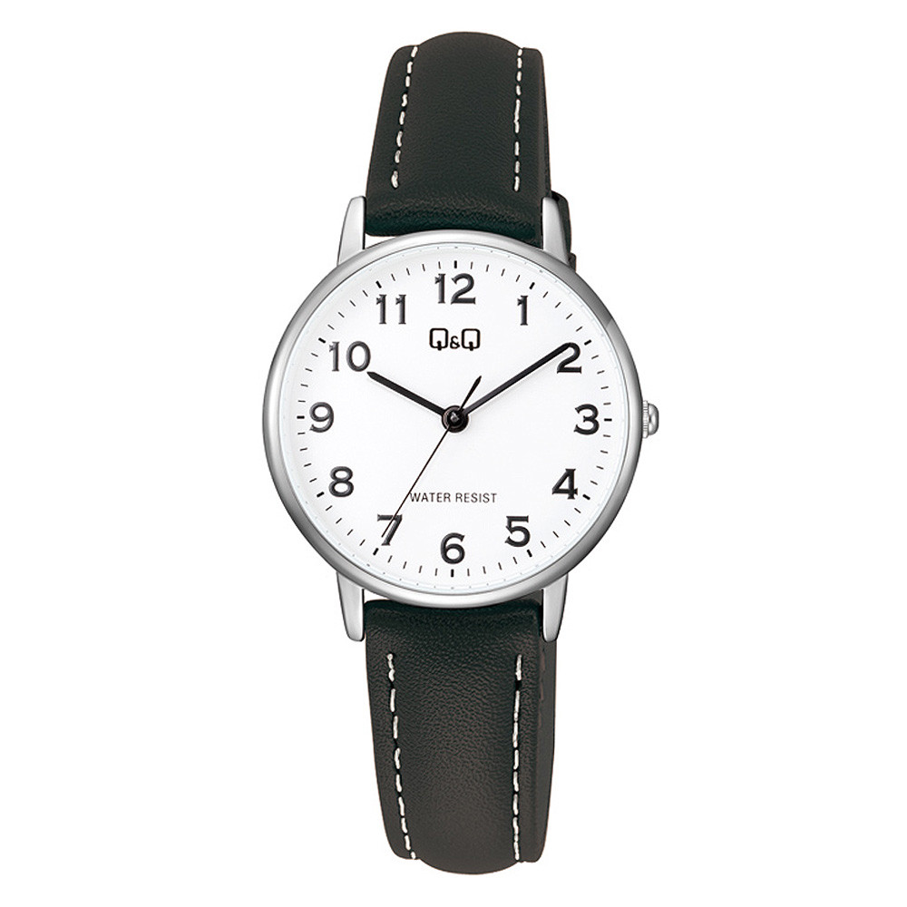 Q&Q női karóra, quartz, ezüst színű fémtok, fehér színű arab számos számlap, fekete színű bőrszíj, C65A-004PY