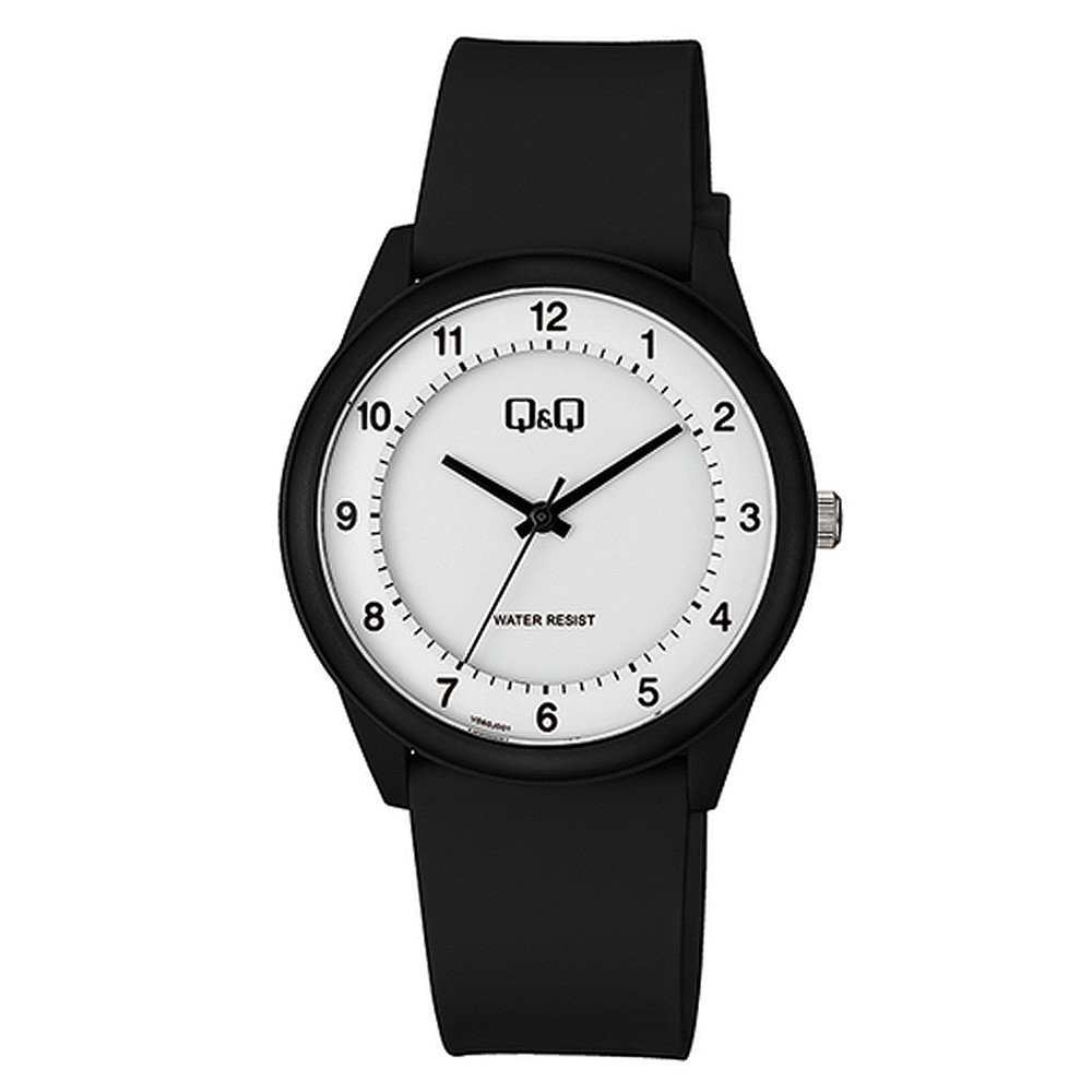 Q&Q férfi karóra, quartz, fekete színű műanyag tok, fehér színű számlap, fekete színű műanyag szíj, VS60J001Y