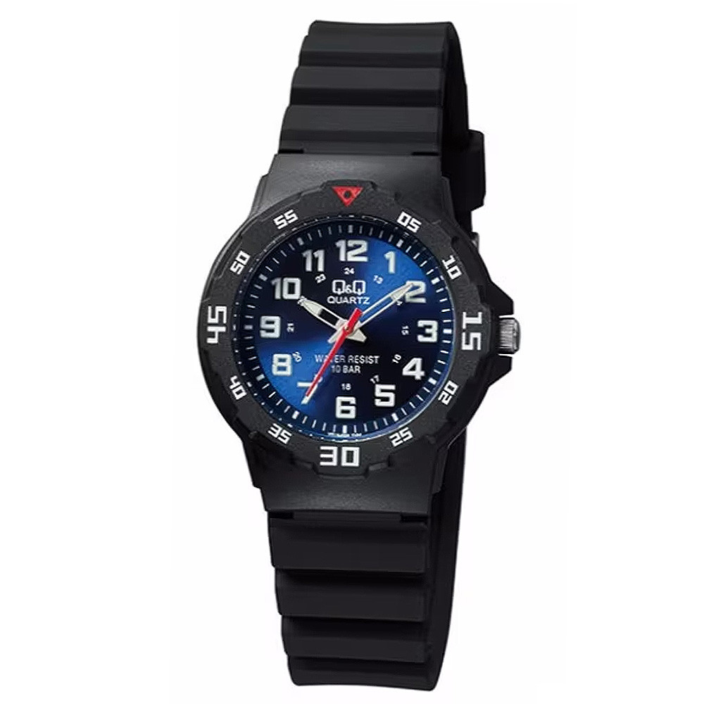 Q&Q gyerek karóra, quartz, fekete színű műanyag tok, kék színű számlap, fekete műanyag szíj, VR19J005Y