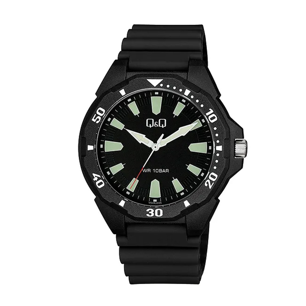 Q&Q férfi karóra, quartz, fekete színű műanyag tok, fekete színű műanyag szíj, fekete színű számlap VS44J005Y