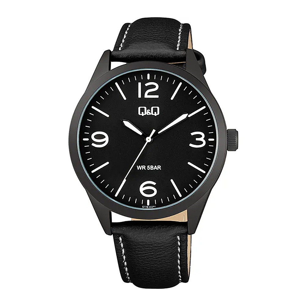 Q&Q férfi karóra, quartz, fekete színű fémtok, fekete színű bőrszíj, fekete színű számlap, Q77B-002PY