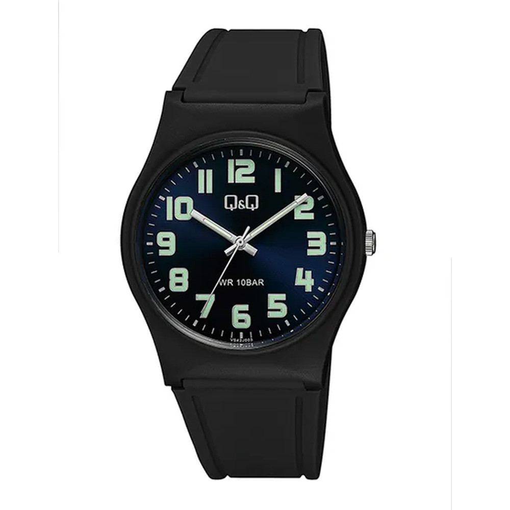 Q&Q férfi karóra, fekete színű műanyag tok, kék színű foszforeszkálós számlap, fekete műanyag szíj VS42J003Y