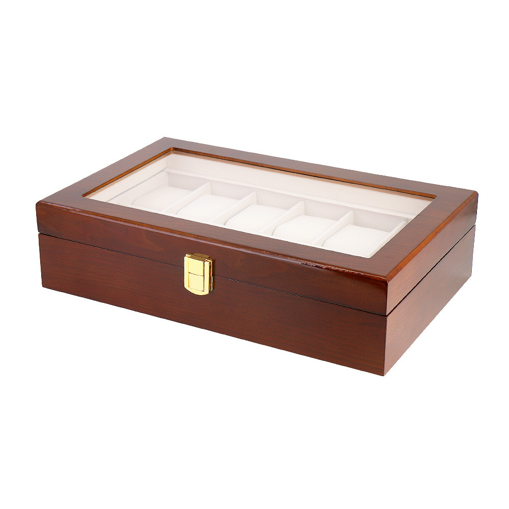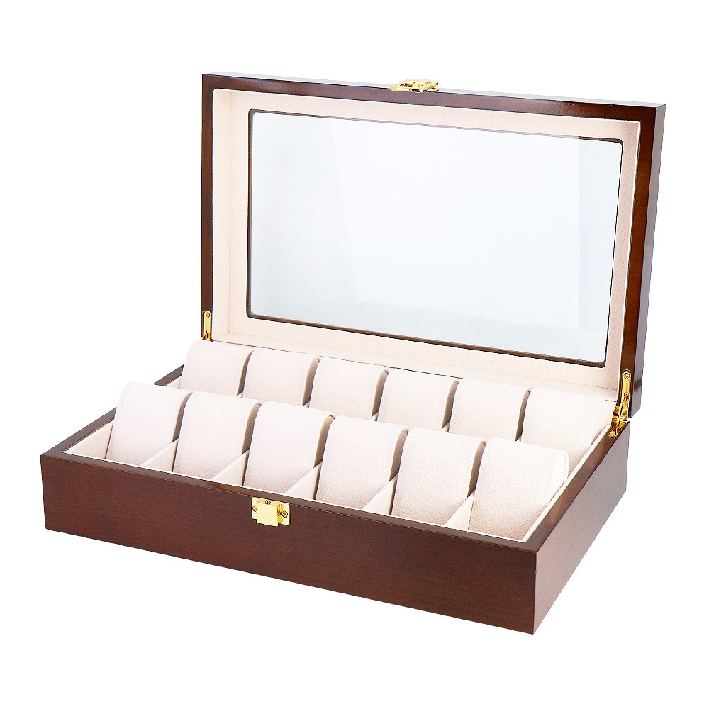 Óratartó doboz, 12 db karórához, kívül barna színű festett fa felület, belül bézs textil borítás