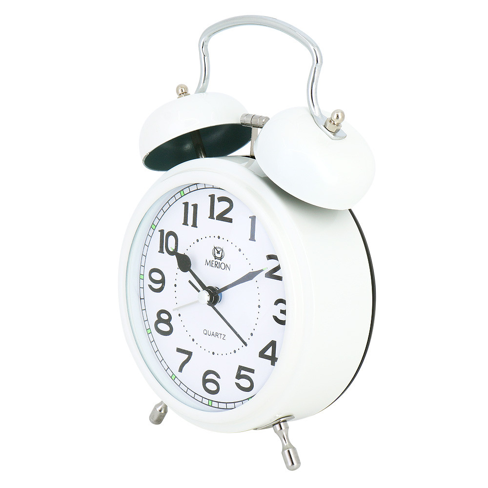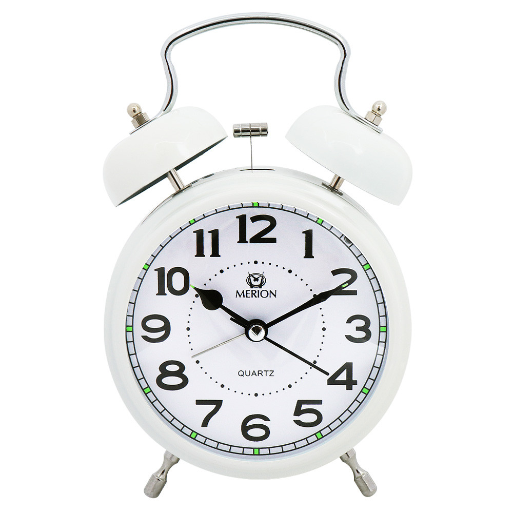 Fehér fémtokos ébresztőóra dupla haranggal és lumineszkáló részletekkel