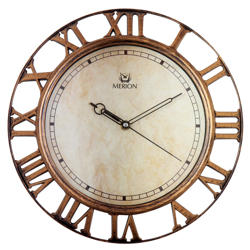 - Áttört külső keret: A tok széle nem zárt, hanem a masszív bronz színű római számok közötti üres tér engedi láttatni a falat, így az óra szervesen beleolvad a háttérbe, miközben plasztikus díszként emelkedik ki belőle.