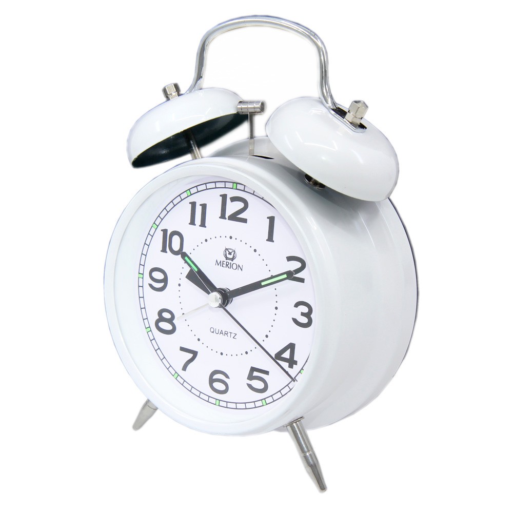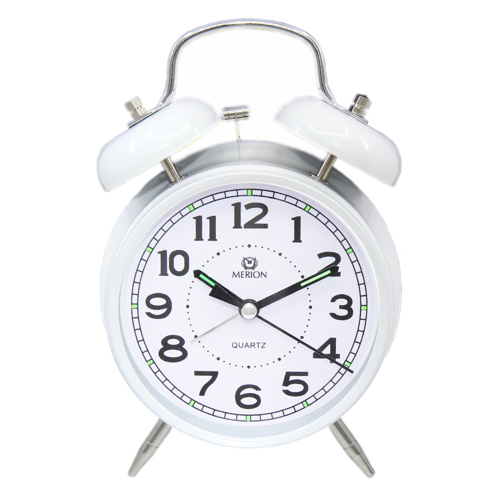 Fehér fémtokos ébresztőóra dupla haranggal és lumineszkáló részletekkel