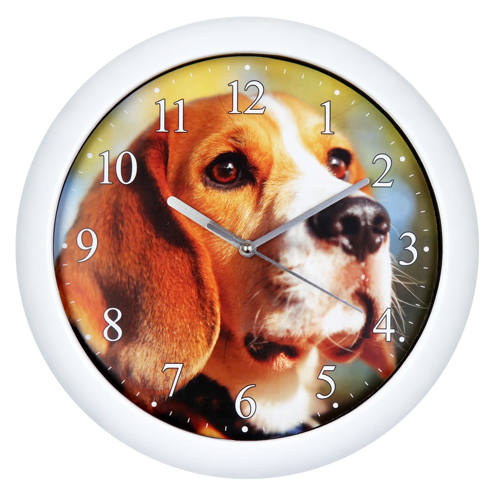 Válassza a hűséges társaságot és a technikai csendet ezzel a dekoratív kutyás faliórával! Ezt a modellt az állatok iránti szeretet és a természetes tónusok ihlették: a számlap központi helyét elfoglaló, értelmes tekintetű Beagle fotója olyan kedves karaktert ad a falfelületnek, amely azonnal otthonosabbá teszi környezetét.