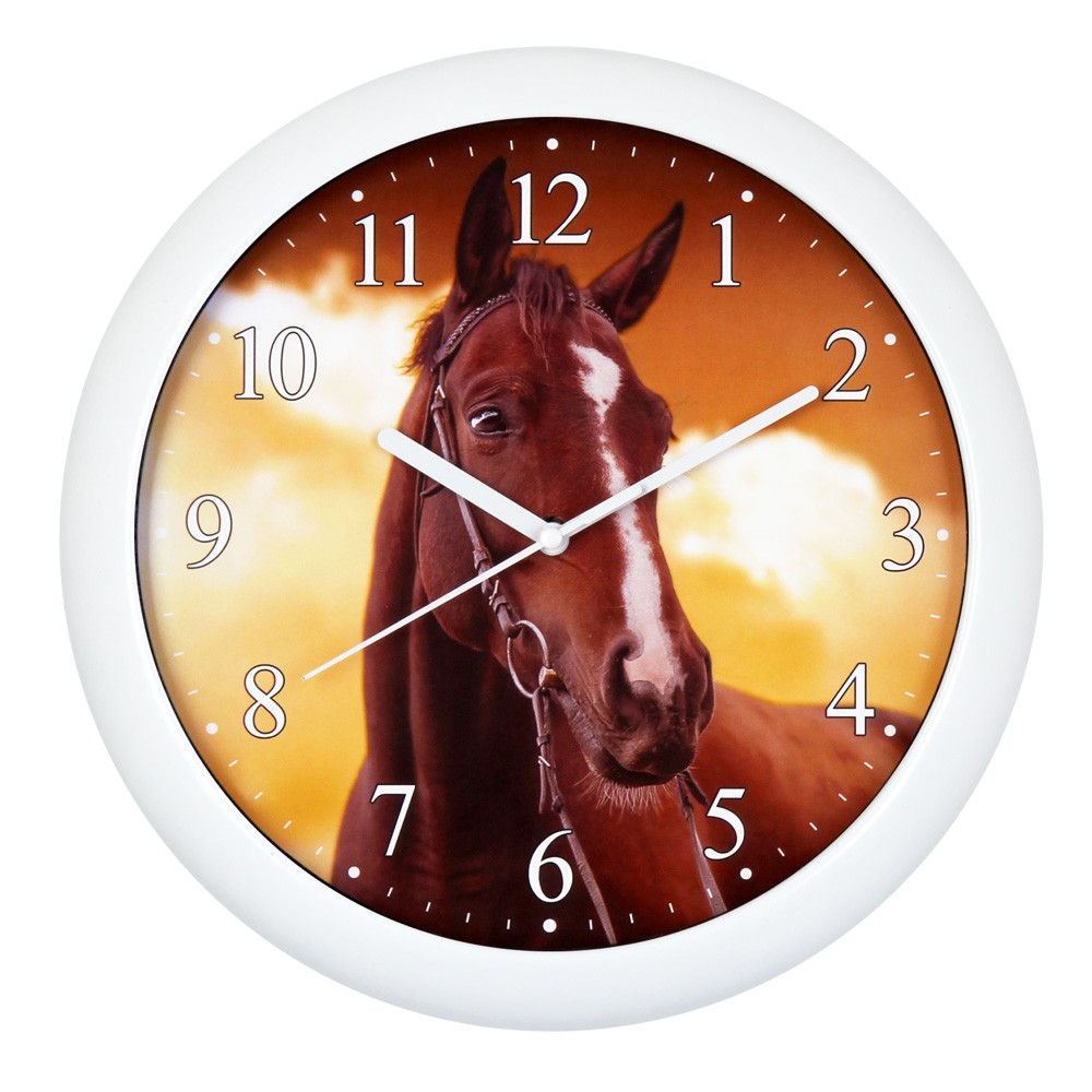 Élvezze a természet nyugalmát és a technikai csendet ezzel a dekoratív lovas faliórával! Ezt a modellt a lovak iránti mély szeretet és a naplemente aranyló fényei ihlették: a számlapon megjelenő, kantározott barna ló élethű portréja olyan bensőséges és megnyugtató karaktert ad a falfelületnek, amely azonnal otthonosabbá teszi környezetét.