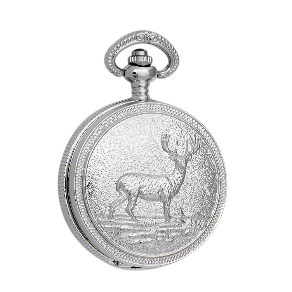 A zsebóra tokja elegáns, ezüst színű fémből készül, amely jól harmonizál formális és lezserebb öltözékekkel is. A tokon látható szarvas minta visszafogottan dekoratív, így nem válik túlzottan díszessé, mégis egyedi megjelenést biztosít. Ez a motívum különösen vonzó lehet természetkedvelőknek, vadászat iránt érdeklődőknek vagy mindazoknak, akik szívesen viselnek erdő- és állatvilág ihlette kiegészítőket.